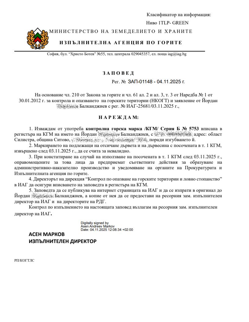 Заповед № 1148/04.11.2025 г. на изпълнителния директор на ИАГ за изваждане от употреба на контролна горска марка